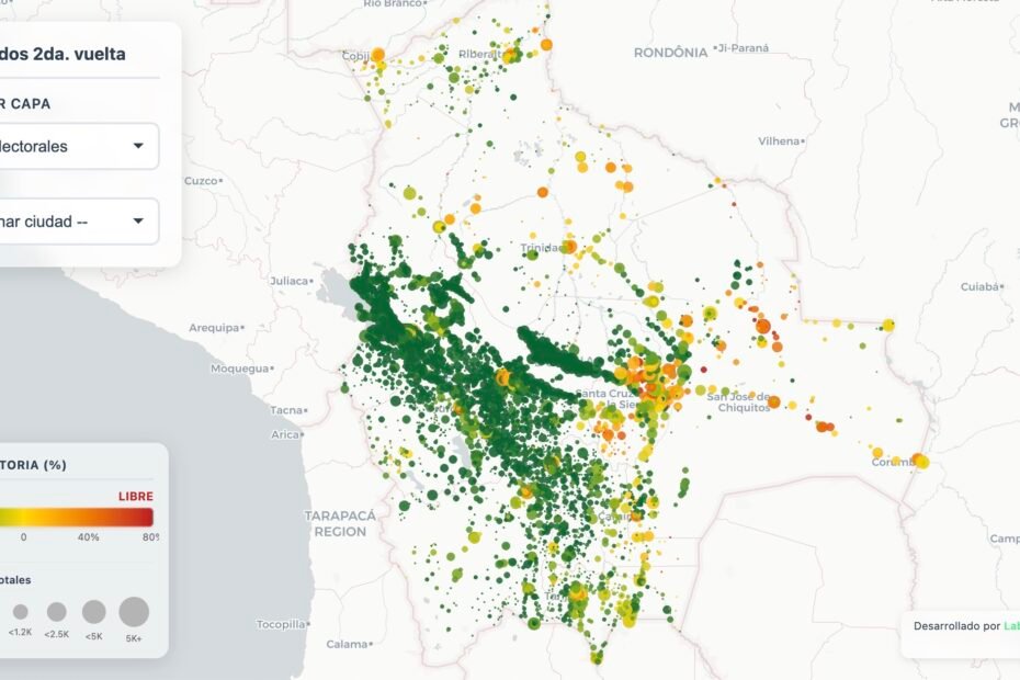 Con el fin de ofrecer una imagen más matizada del voto territorial, elaboramos mapas con una escala continua para observar el margen de victoria entre Libre y el PDC en esta segunda vuelta. Te invitamos a explorar los matices del voto en los diferentes recintos… Leer más »Mapa de resultados electorales de segunda vuelta en Bolivia